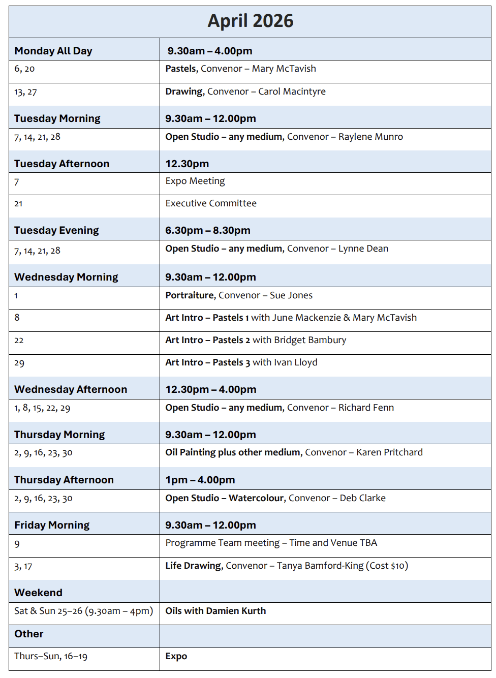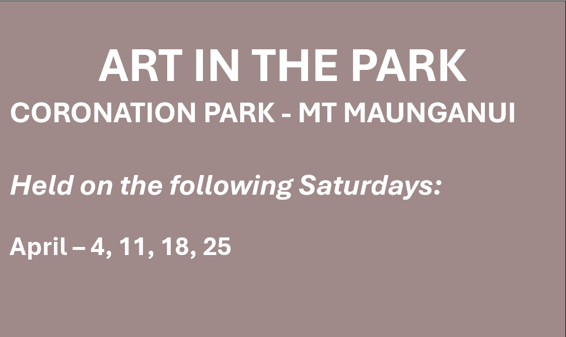 This is a wonderful opportunity for members of the Tauranga Society of Artists to display and sell your art, mix with fellow artists, and interact with the public – local and from other area of New Zealand, and overseas. Held at Coronation Park in Mt Maunganui, set up time is from 8am and end time is before 5pm. If you are interested in joining this activity, come along on one of the dates listed and have a look at how this happy little group set themselves up and present their artworks. There are lots of tips and tricks to this kind of display. Liz Cross and her Art in the Park cohorts will welcome you and share their Art in the Park experience, if Council makes any changes to the listed dates, you will be advised by group email.